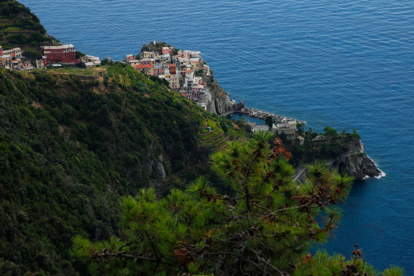 Nachdem wir eine halbe Stunde in einem dubiosen Hauseingang in Manarola gefroren haben, ist der Regen endlich vorbei und wir machen uns auf den Weg. Vor uns liegen 1.200 Stufen. Wir fluchen und schwitzen, denn die Luftfeuchtigkeit in den bewaldeten Hängen liegt knapp über der einer finnischen Sauna. Doch immer wieder müssen wir aufhören, uns aufzuregen, weil der Blick nach unten einfach nur fantastisch ist.