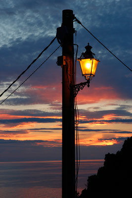 Als wir nach einigen Pausen, Schnappatmung und wackeligen Knien gegen Abend und etwa dreieinhalb Stunden später in Corniglia ankommen, beschließen wir, morgen entweder für die einfacheren und kürzeren Wege zu zahlen, komplett den Zug zu nehmen oder einfach tot umzufallen. Der Abend in Corniglia ist jedoch wunderbar. Die Sonne bricht hervor und taucht die Gässchen in warmes Licht. Die bunten Fassaden ergeben sich dem orangefarbenen Farbspektakel am Himmel und strahlen wie rechteckige Laternen. Auf einmal erscheint zwischen den Wolken ein kleiner Fleck, der wie ein punktueller Regenbogen aussieht. Ich eskaliere kurzerhand mit der Kamera und vergesse, dass meine Beine nur noch aus Krampfadern bestehen, während Dani beinahe eine Straßenkatze adoptiert.