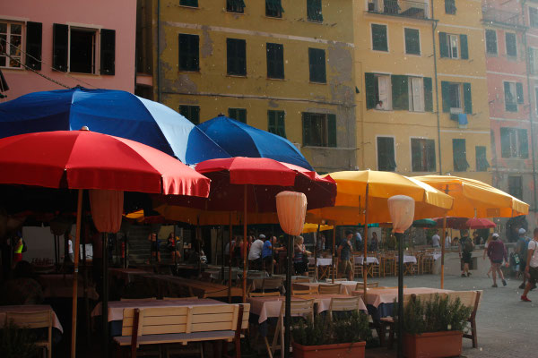 Mysteriöserweise sind auf einmal zwei Stunden vergangen und wir rasen schon weiter nach Vernazza. Dort ist irgendetwas anders. Das Dorf nimmt uns sofort gefangen – erst recht, als wir den wunderschönen Hafen erblicken. Boote schaukeln auf dem türkisfarbenen Wasser, der Stoff bunter Schirme auf dem offenen Platz flattert im Abendwind. Mehrere Burgen erheben sich auf den Hängen und das sanfte Licht tut sein Übriges. „Das ist es!“, sind wir uns einig. Das schönste Dorf von Cinque Terre! In der goldenen Stunde steigen wir die Klippen hinauf und die Sonne zaubert minütlich andere Schatten, Farben und Nuancen auf die Fassaden Vernazzas. Als wir oben angekommen sind, liegt schon ein violettes Blau in der Luft. Wenn ihr den Weg links vom Bahnhof hinaufgeht, habt ihr kurz hinter dem Ristorante Bar La Torre eine fabelhafte Möglichkeit, euch auf ein paar Steine zu setzen und poetisch über das Meer und die Stadt zu schauen. Dort oben sind kaum Menschen und die Stille mitsamt dem völlig freien Blick ist einfach unglaublich! Allerdings solltet ihr ein bisschen mehr Achtung vor den massiven Kakteen haben, als ich, weil ich mich fast in einen hineingesetzt hätte. Hust.