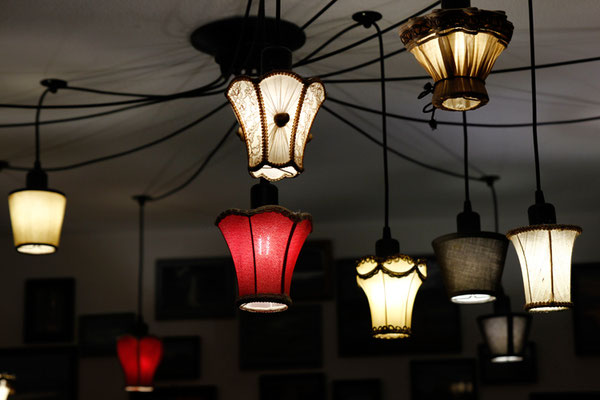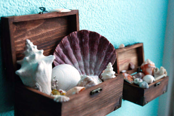 Here in the small gallery below, you will find some finished projects. A chandelier made of second-hand lampshades collected from all over the world, small wooden treasure chests to use as “shelves” for my shell collection, a door covered with wallpaper that looks like books on a bookshelf (and yes, I painted the Totoro myself) and the new neon signs in my Rock'n’Roll kitchen.