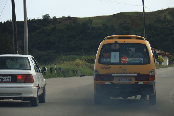 Apropos Cotopaxi. Dort sind wir am nächsten Tag. Ich sag ja, es liegt alles sehr nah beieinander in Ecuador. Wir fahren mit 80 an einem Schild vorbei, das 60 als Höchstgeschwindigkeit vorgibt, während die Einheimischen mit über 100 an uns vorbeidieseln. Und das meine ich wörtlich: Wenn man nicht durch völlig abgefahrene Überhol-Stunts auf einspurigen Bröckel-Straßen am Abgrund stirbt, holt man sich zumindest einen Schatten auf der Lunge. Hier pestet wirklich jedes Fahrzeug dunkle und abartig stinkende Wolken in die Luft. Aber bestimmt erreichen wir das Pariser Klimaziel trotzdem noch. 2076 oder so.