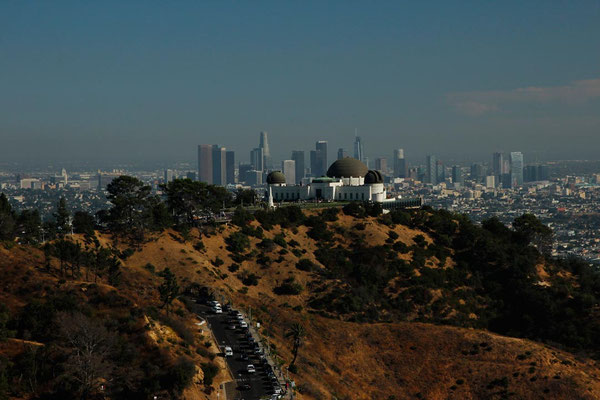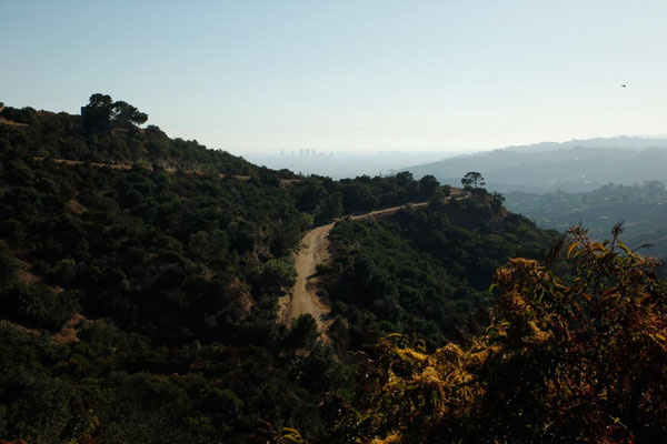 Gut, dass „langsam“ und „bedächtig“ nicht in meinem Wortschatz vorkommen. Ich stampfe den ersten Hügel hinauf und renne wie ein Huhn mit der Kamera hin und her, weil man plötzlich einen verdammt tollen Blick auf das Griffith Observatory und die Skyline von Los Angeles hat.