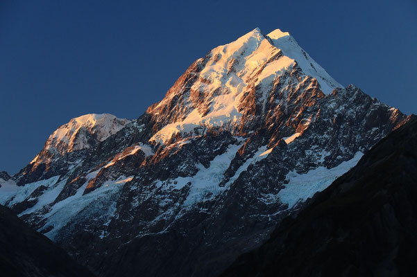 “WoooaHoHa!” I shout as we approach the massive mountain in the evening light. That's Māori language and it means holy shit, it's beautiful! Joking, of course. But with its unique shape, isolation, and its 12,218-foot elevation, Mount Cook stands out not only as the highest mountain in New Zealand but also as distinctive and awesome in appearance as the Matterhorn in Switzerland.