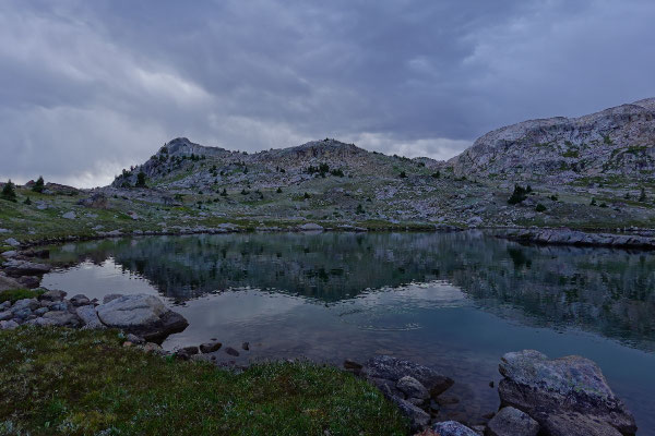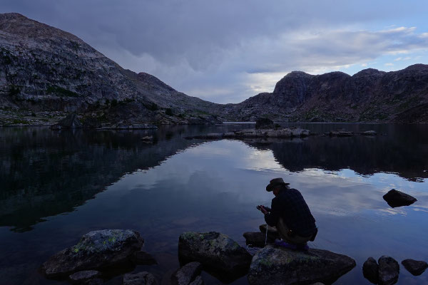 Then we reach a lake that seems to lie in a stone basin. The ground around it is fairly level. A good place to pitch a tent. So that's what we do. Then we take the water filter to the shore and collect our drinking and cooking water for the night. Then we just sit there. On a rock. It is completely silent except for a slight breeze. Slowly, it gets darker and darker. It's just us and the mountains. It's like meditation without meditating. I am completely at peace with myself and feel the night rising like a tide behind the horizon.