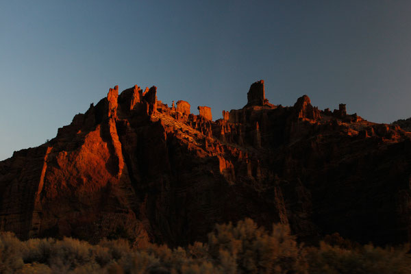 Der Fluss ist glasklar und gurgelt über die Steine als hätte jemand Murmeln ausgeschüttet. An seinem Ufer leuchten die gelben Blätter der Bäume in der tiefstehenden Sonne. Vergängliches Blattgold. Am Horizont, wo das Gebirge den Himmel berührt, liegt ein violetter Schimmer und in den Gipfeln der Schnee, weich und weiß. Ein eisiger Wind fegt an einem Gesicht vorbei, wechselt sich ab mit wärmenden Strahlen.