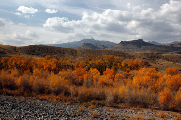 Wyoming ist seltsam. Es gibt drei Monate Sommer mit bis zu 30 Grad und neun Monate Winter mit bis zu minus 30 Grad. Frühling und Herbst werden in wenigen Tagen abgehandelt, als wären sie Teil eines dringenden Schlussverkaufs. Nachdem ich Anfang Oktober heimlich durch das Schlupfloch Aruba in die USA eingesickert bin, habe ich es geschafft, die zwei Stunden zu erleben, in denen es Herbst war. Und was für ein Herbst! Der blaue Himmel weit offen, wie ein Dom, der sich über den Rocky Mountains wölbt. Endlose Straßen, goldgelbe Bäume, gigantische Federwolken und wilde Tiere. Bighorn Sheep, Rehe, Grizzly Bären und der Hintern eines Berglöwen (ärgerlicherweise habe ich mir gerade in dem Moment die Jacke im Auto ausgezogen und nicht richtig hingeschaut, als mein Freund an dem Löwen vorbeifuhr). Die Luft ist kalt, die Sonne strahlt und es riecht nach nassem Laub.